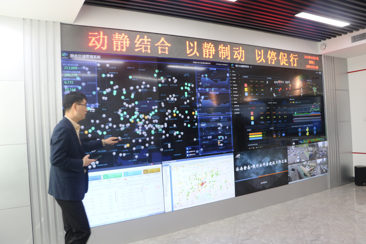 大家首先參觀了七樓數(shù)創(chuàng)中心。“城市交通大腦”及智慧停車平臺(tái),“一云四中樞”智能交通總體架構(gòu),對(duì)接交通運(yùn)輸、氣象等部門管理數(shù)據(jù),匯入滴滴、高德等互聯(lián)網(wǎng)企業(yè)數(shù)據(jù),構(gòu)建動(dòng)態(tài)交通感知大數(shù)據(jù)資源池,為聚力打造的泉城智能交通管理新生態(tài)。